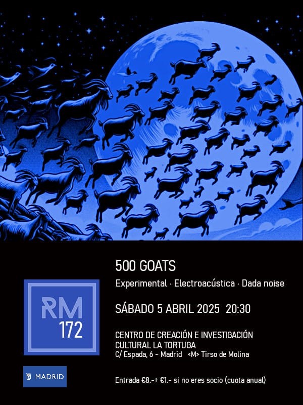 500 goats está formado por los artistas sonoros José Mª Pérez-Flor y Juan Cepas. Empezaron durante la pandemia de COVID, improvisando y grabándose mutuamente. Sus composiciones, dinámicas y en constante evolución, combinan sonidos electrónicos, guitarras sincopadas, noise, grabaciones de campo y texturas lo-fi, adoptando un proceso creativo espontáneo y lúdico. https://500goats.bandcamp.com/ RARAS MÚSICAS comenzó su actividad […]